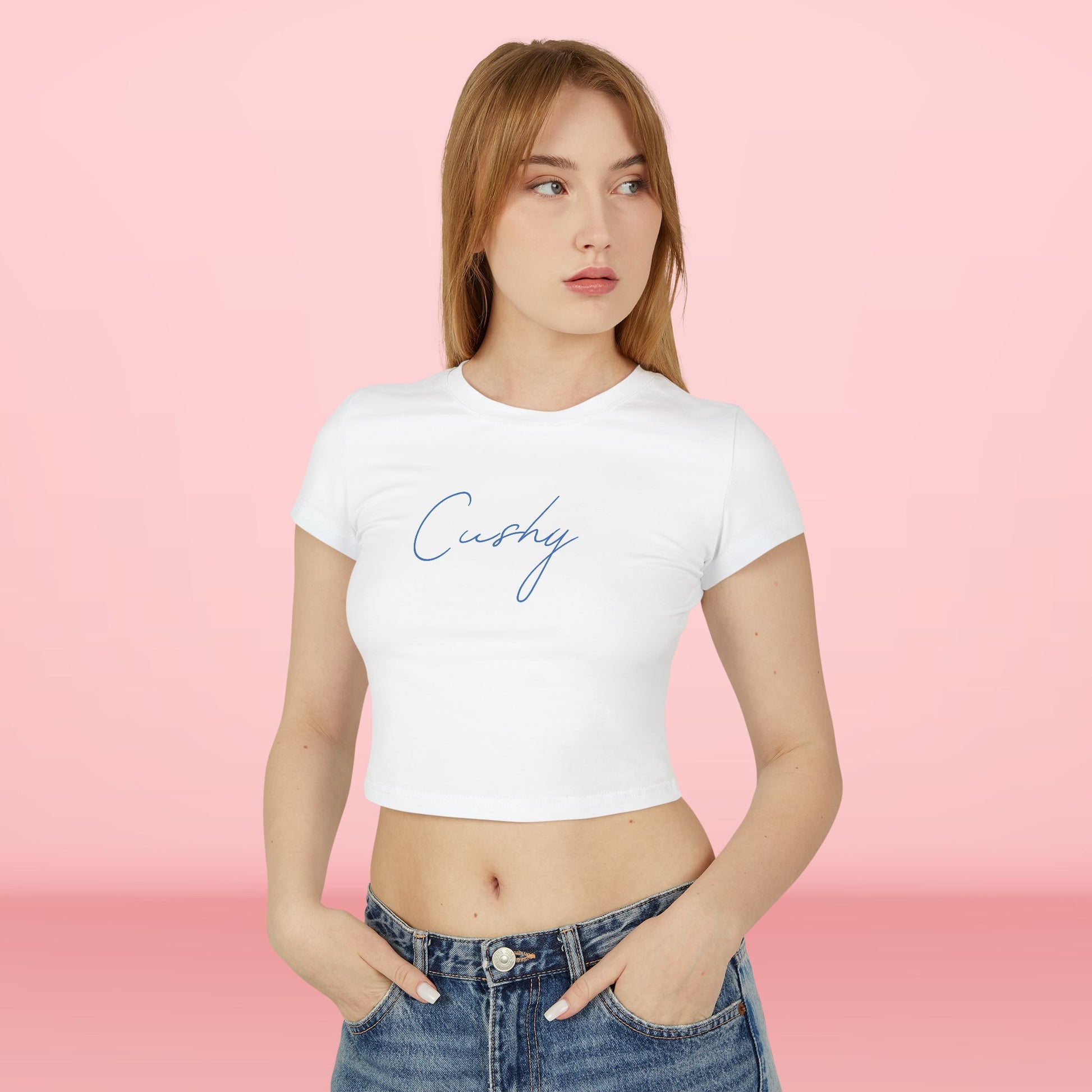 Embrace effortless confidence with the Cushy Baby Tee from the Her Collection. Featuring the word "Cushy" in soft blue cursive, this slim-fit tee is designed to flatter while delivering ultimate comfort. With its mid-length cut and eco-friendly 100% organic cotton rib fabric, it’s a perfect blend of style and sustainability.