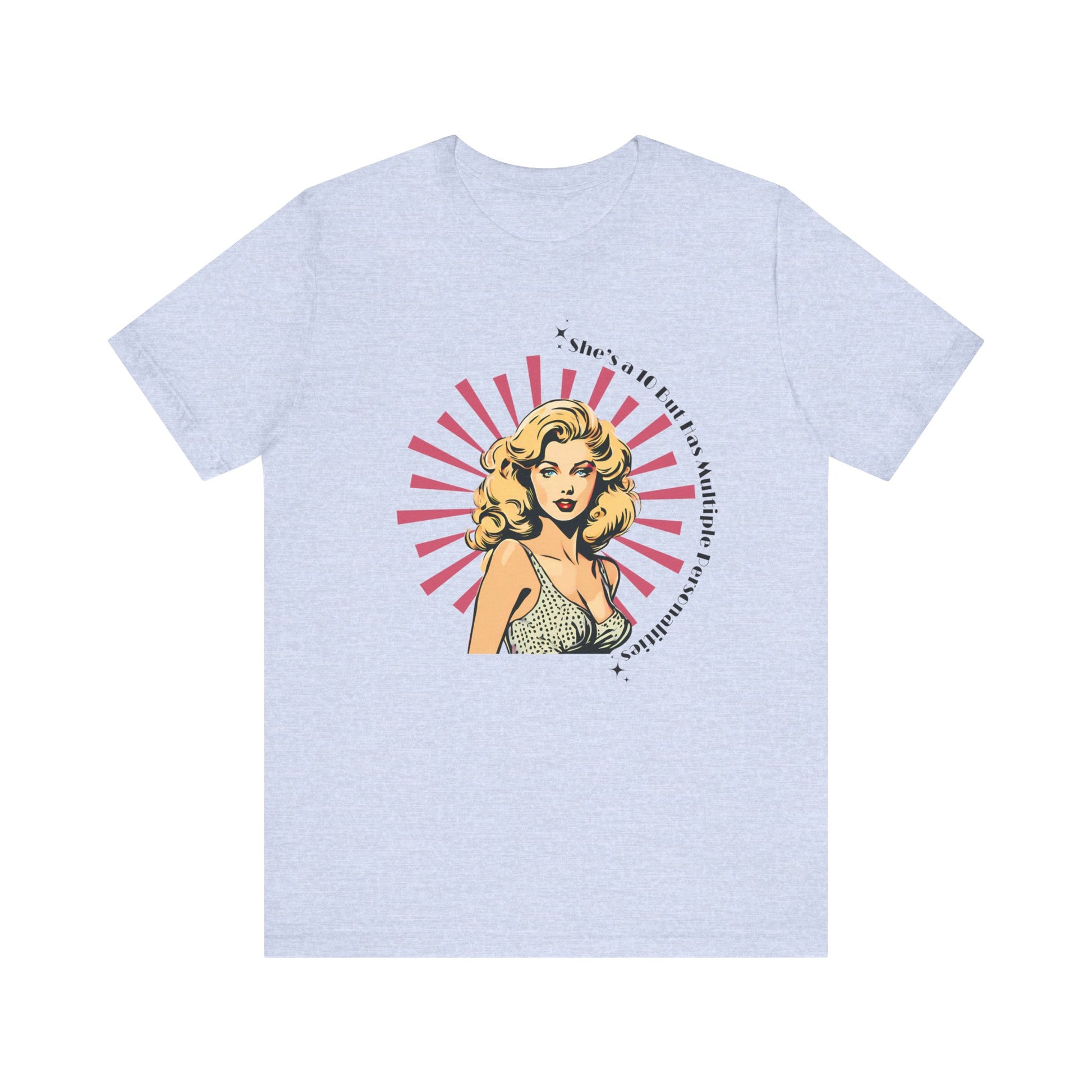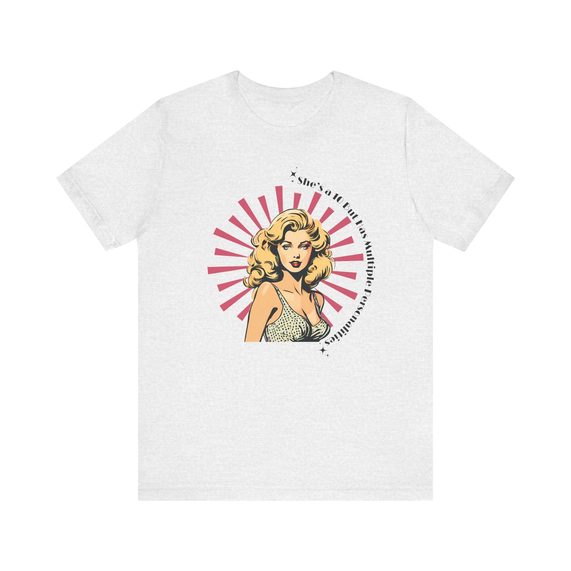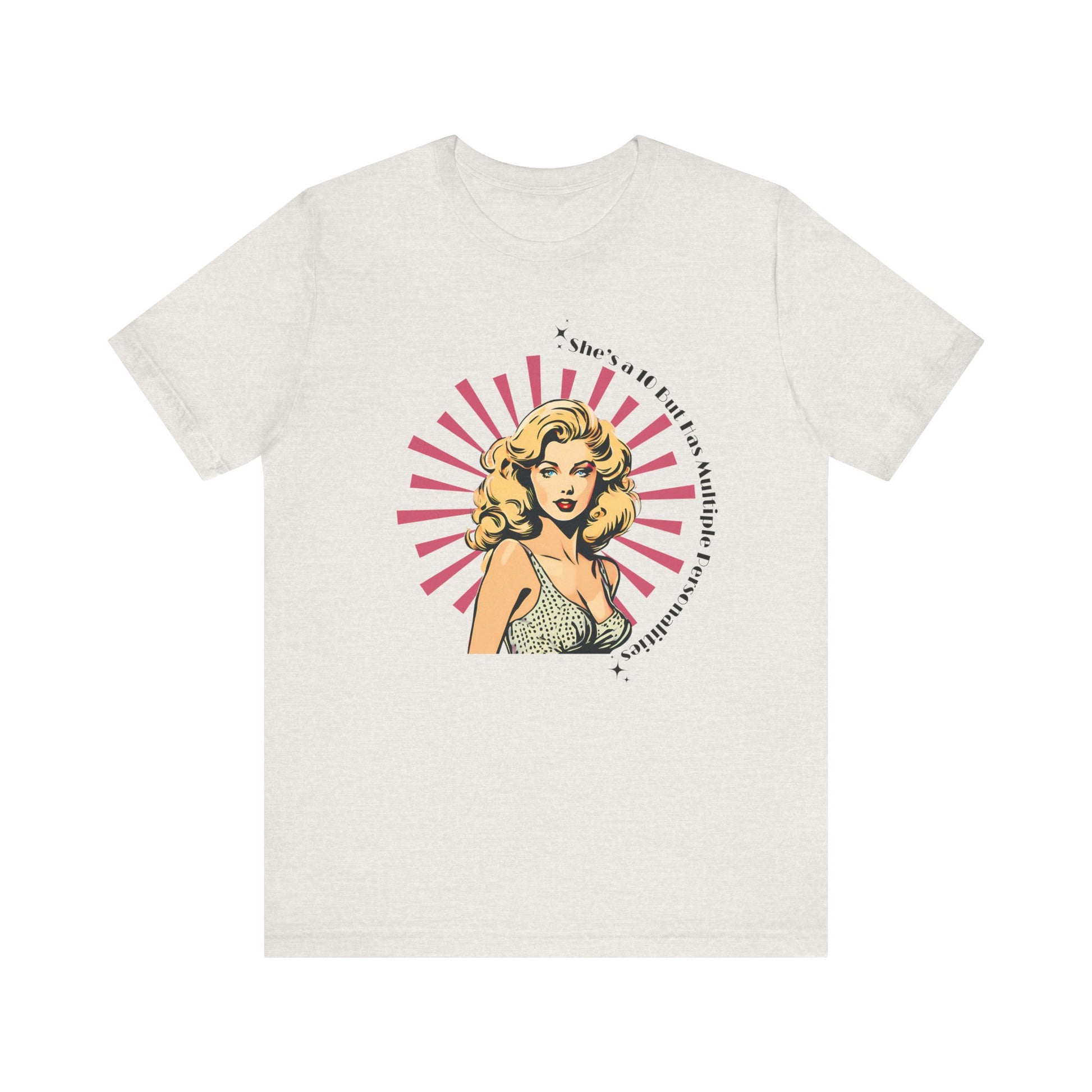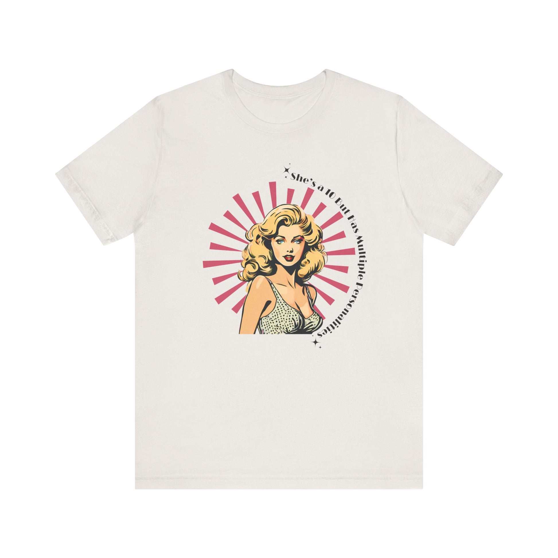 This 'She's a 10' Tshirt features a retro chic design on the front, making it a stylish and versatile addition to any wardrobe. Made with soft cotton and quality print, this classic unisex jersey short sleeve tee is perfect for active and leisure wear. The retail fit and crew neckline make it suitable for casual and semi-formal settings, while the tear-away label minimizes skin irritations. Ideal for those looking for a comfortable and trendy t-shirt to wear on various occasions.