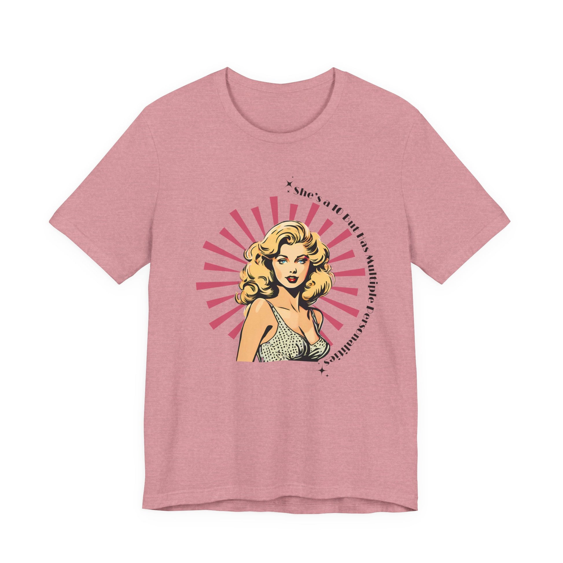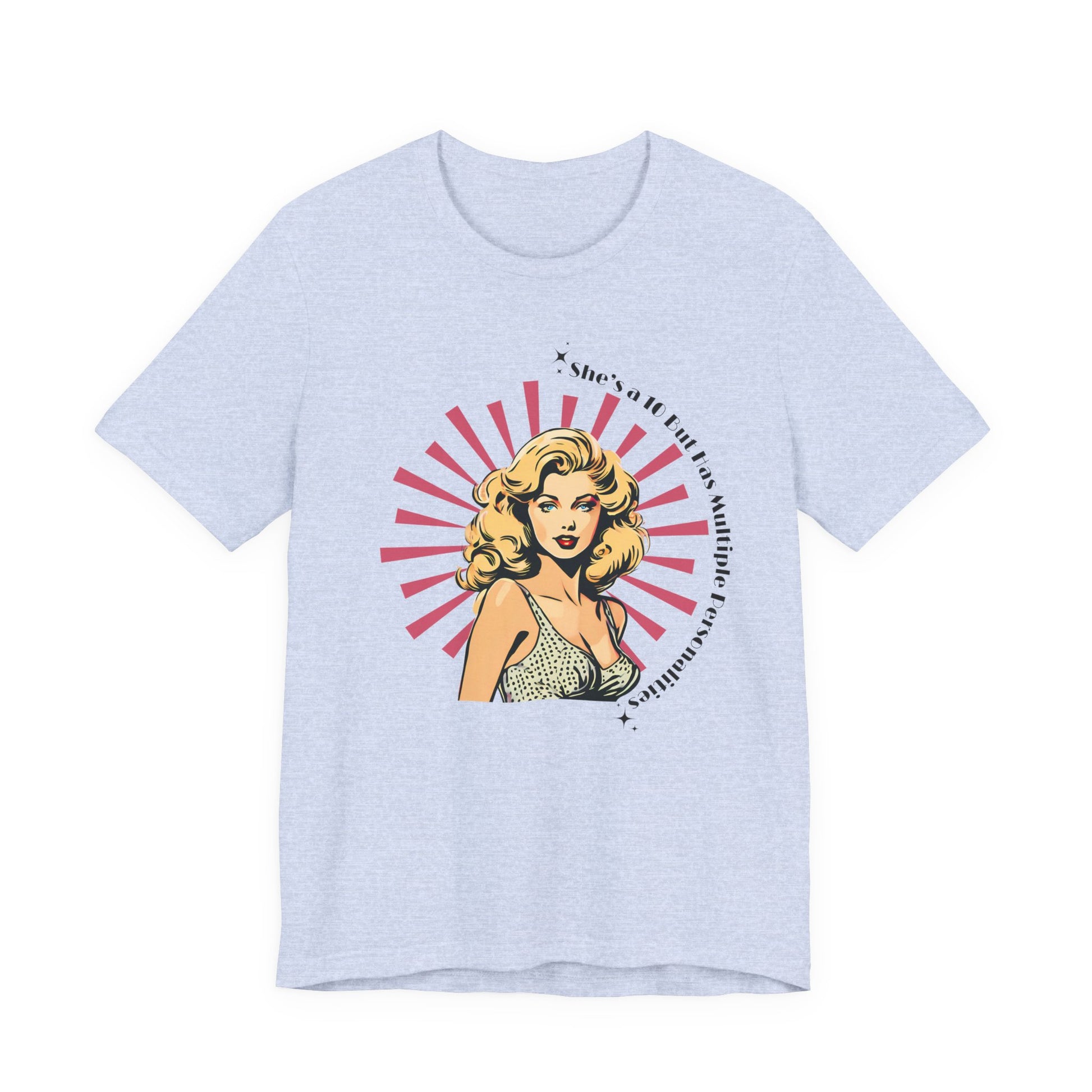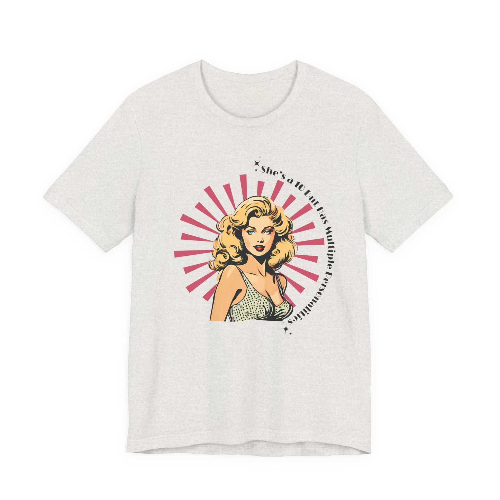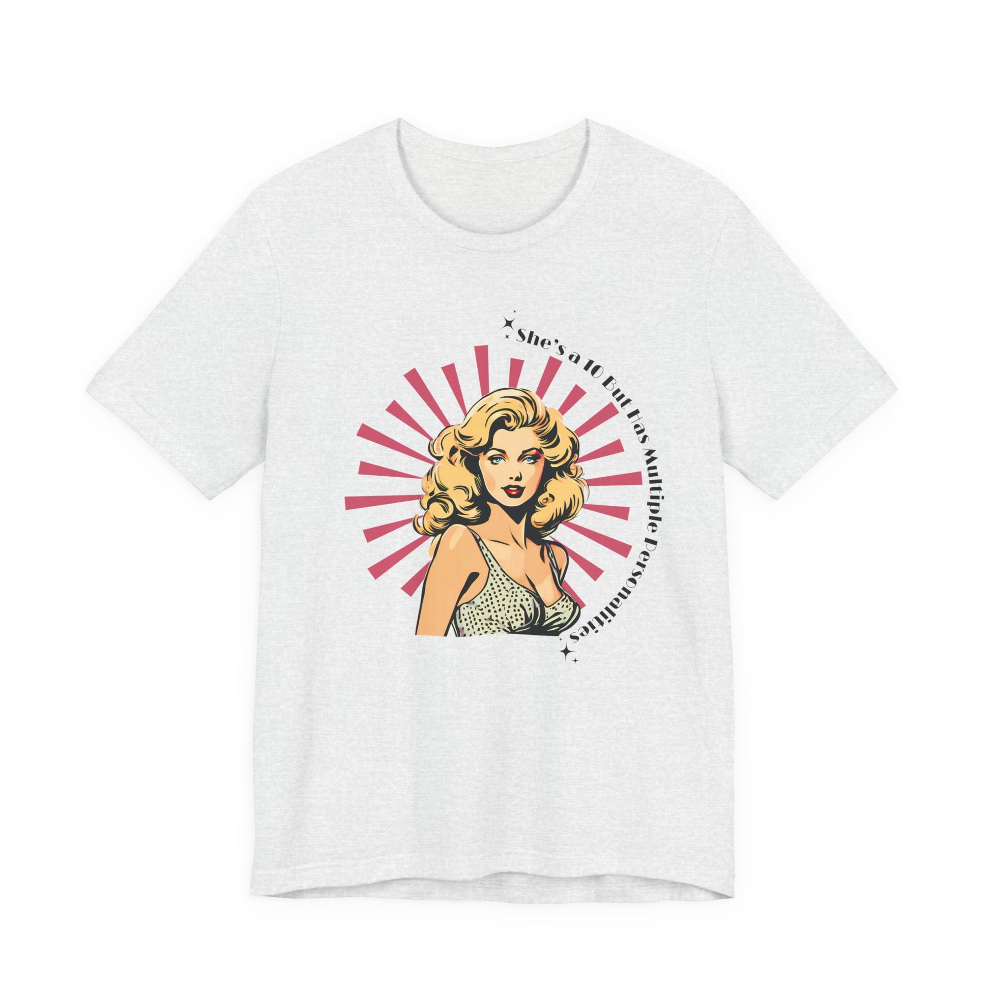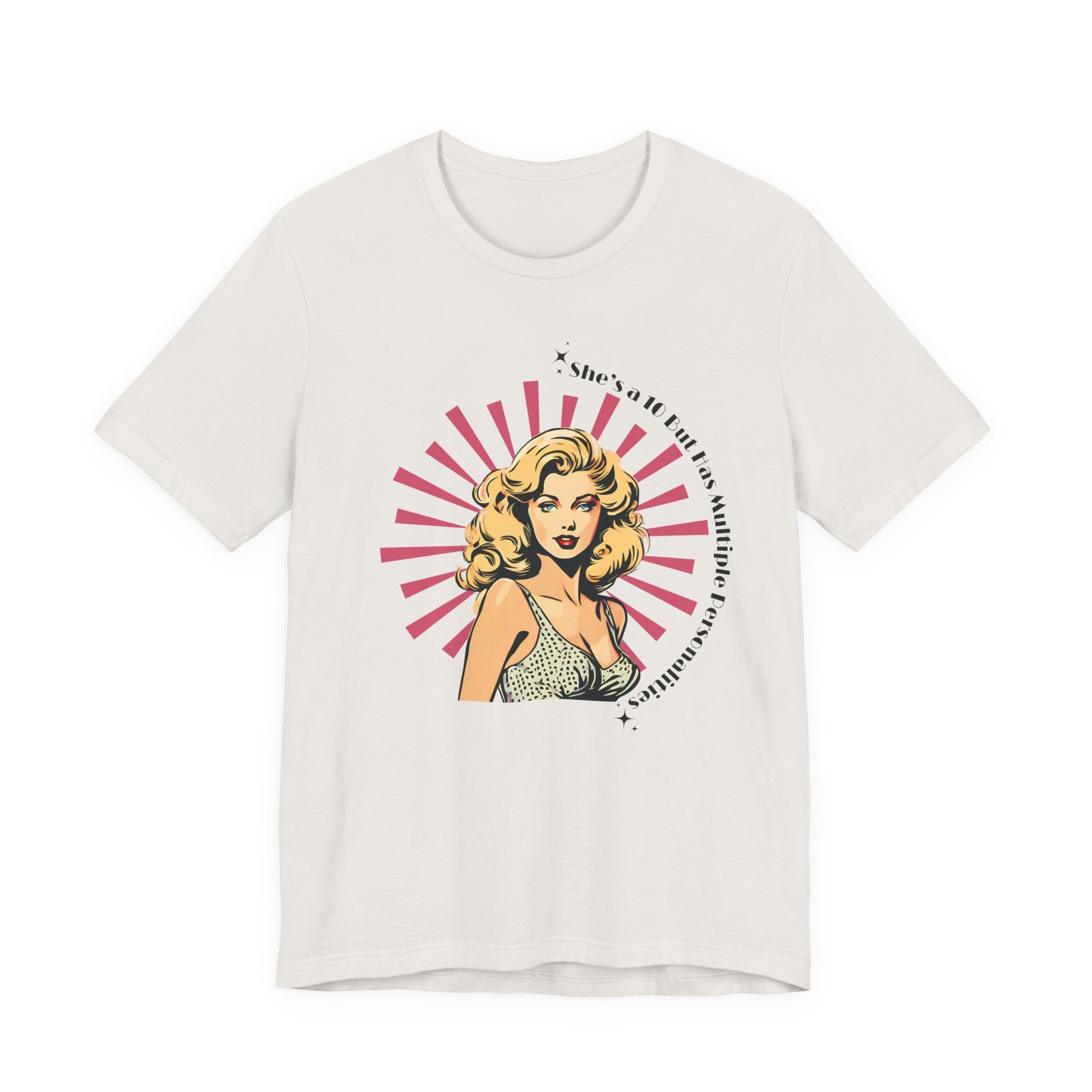 This 'She's a 10' Tshirt features a retro chic design on the front, making it a stylish and versatile addition to any wardrobe. Made with soft cotton and quality print, this classic unisex jersey short sleeve tee is perfect for active and leisure wear. The retail fit and crew neckline make it suitable for casual and semi-formal settings, while the tear-away label minimizes skin irritations. Ideal for those looking for a comfortable and trendy t-shirt to wear on various occasions.