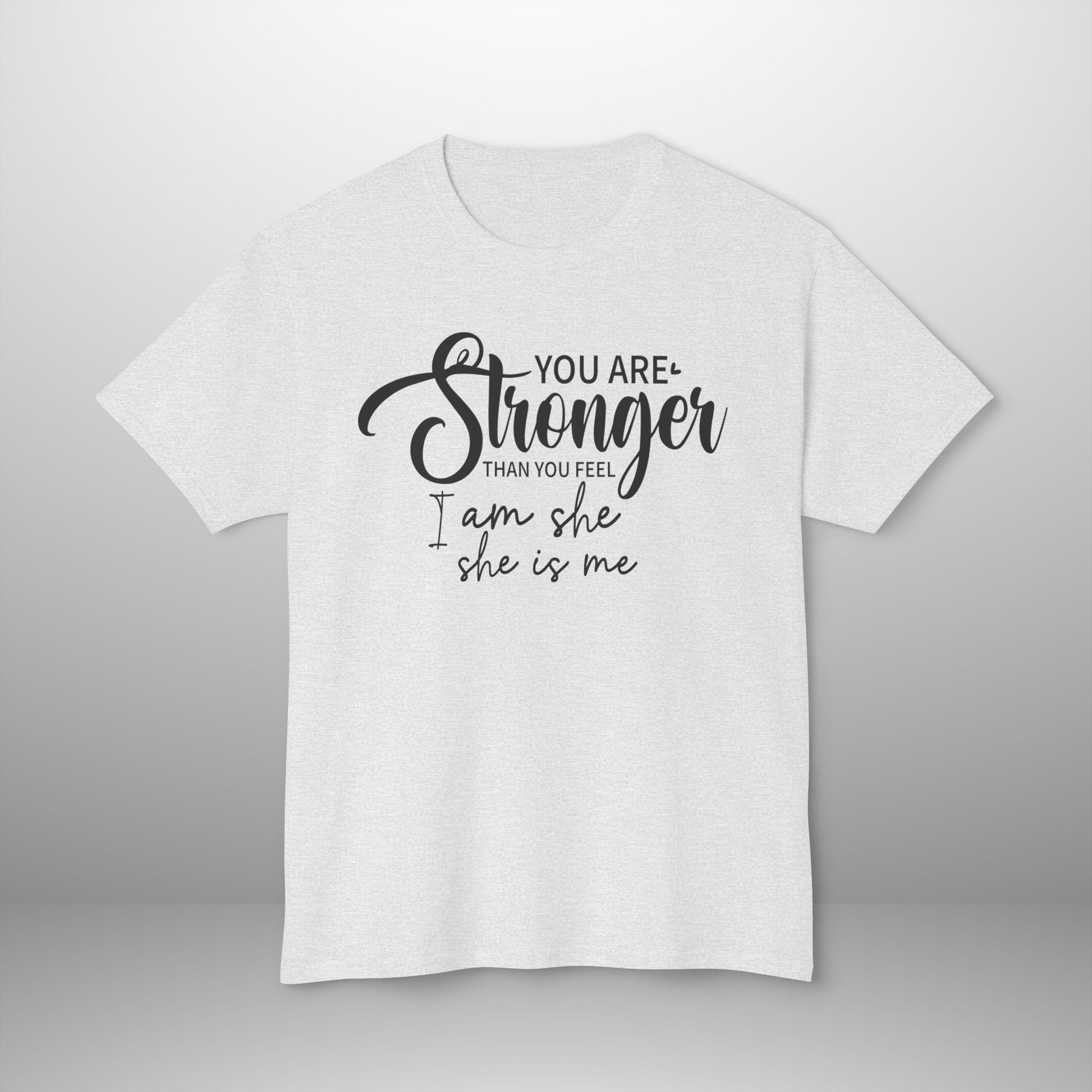 Carry strength with you wherever you go in our “Stronger” t-shirt. Featuring the powerful message: “You are stronger than you feel, I am she, she is me,” this tee is a daily reminder of resilience, unity, and empowerment.